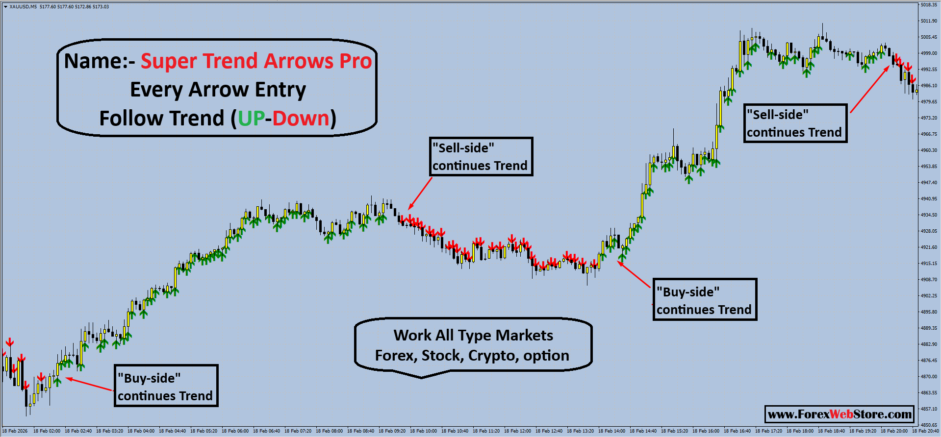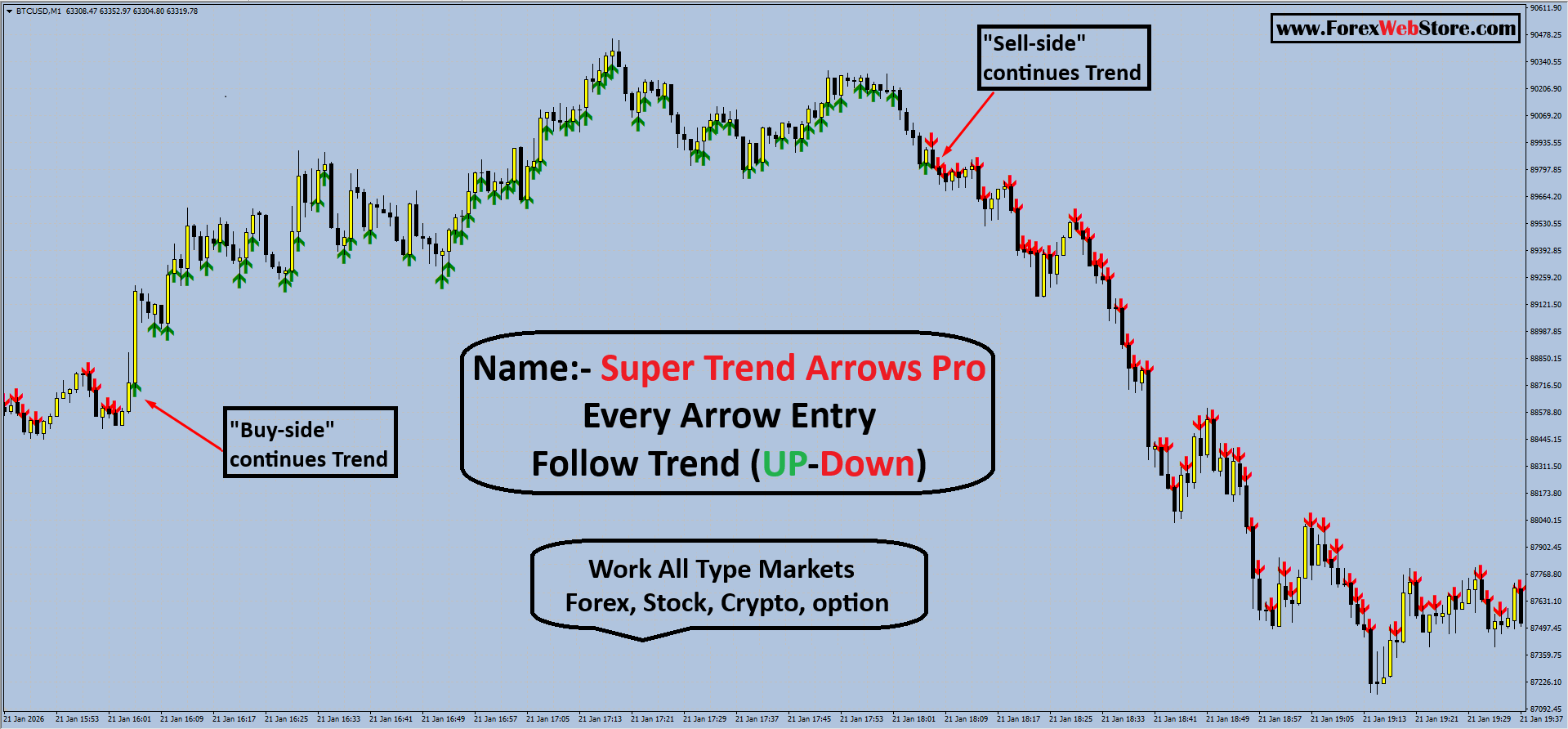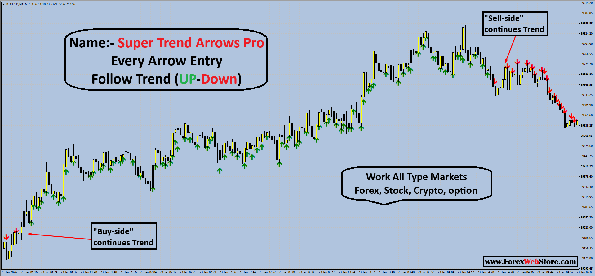 Buy Entry (Long): Enter when a Green Up-Arrow appears. This indicates a “Buy-side” trend continuation.